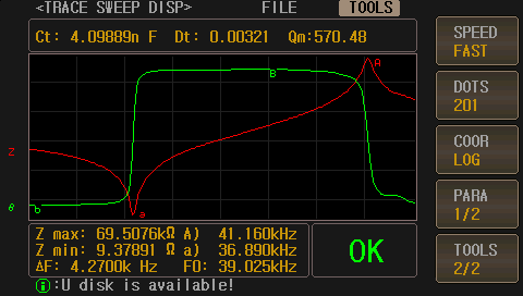 ZX70A/80A阻抗分析儀可以測量和評定壓電陶瓷片、壓電換能器、蜂鳴片等各種器件、設備的參數和性能優劣。通過阻抗-相位-頻率曲線圖和導納圓進行判斷,一目了然。